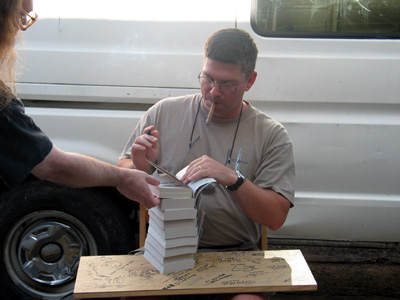 from his new novel, Hell's Faire (in hardcover from Baen Books).![]() ![]() ![]() ![]() John Ringo signs books on the sidewalk. (where it's legal to use that stogie). [digital photos by Lori Buschbaum] |